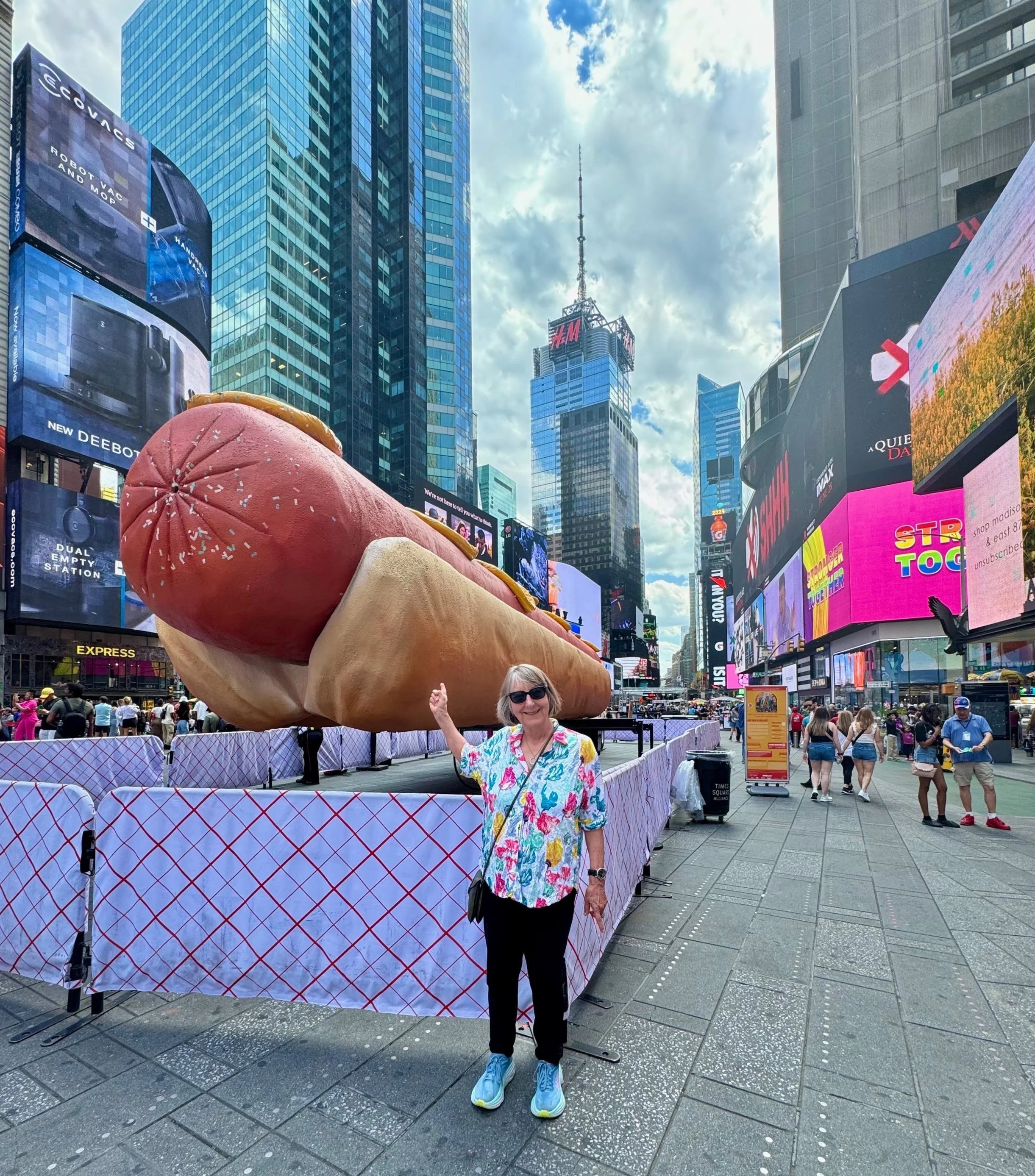 Standing by the Hot Dog in the City, a a 65 foot-long public art installation by the dynamic artist duo Jen Catron and Paul Outlaw. I loved the opportunity to reflect on “the sexual politics of the hot dog” for Times Square Art. June 2024. As usual, the idea that masculinity might have anything to do with the sculpture prompted disbelief.